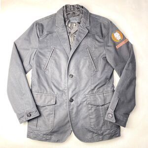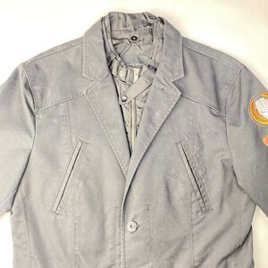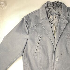 The inner jacket front looks like a retro Members Only jacket, with the full front zip and snap belt collar. But it's only just the front panels, and those actually unbutton from the Blazer and give you a totally different look! Remove the casual jacket lining and just wear the Blazer like a standard jacket. Trench coat type material, so stronger for the weather, great for chilly days. Fits on the smaller size of Medium, especially with sweaters underneath etc. Please check the measurements to get the fit you want!