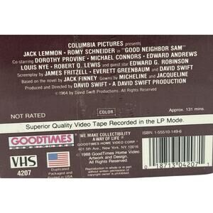 * This is a VHS tape of the 1964 movie "Good Neighbor Sam" starring Jack Lemmon and Romy Schneider. The comedy film, directed by David Swift, was released in 1988 by GoodTimes Home Video in full screen edition. The VHS tape features the classic adventure-comedy. With its timeless humor and talented cast, this VHS tape is a must-have for fans of vintage movies and Jack Lemmon's iconic performances.