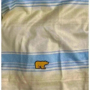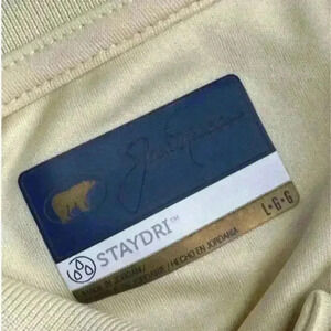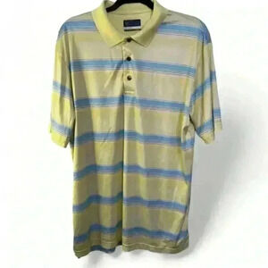 Elevate your casual wardrobe with the Jack Nicklaus Yellow Striped Polo, designed for comfort and style. This men's large polo features a classic collared neckline and a three-button placket, perfect for a neat, sporty look. Crafted from high-quality, breathable fabric, it incorporates StayDri™ moisture-wicking technology to keep you cool and dry during warm summer days. The iconic Golden Bear logo adds a touch of distinction. Ideal for casual outings, golf days, or relaxed weekends. This pre-owned piece is machine washable for easy care.