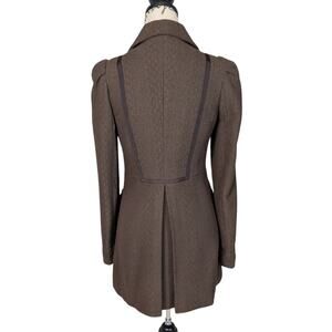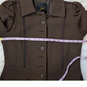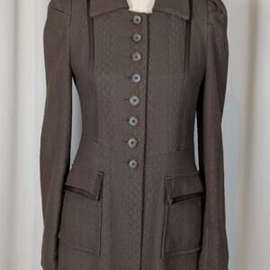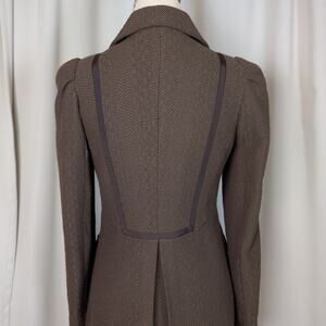 Classic tailoring with a timeless academic feel. This Jack brand longline blazer coat is crafted in rich brown tweed with a subtle herringbone texture and contrast trim detailing. Structured and fitted through the waist with puffed shoulders, long sleeves, pointed collar, and full front button closure. Fully lined with functional flap pockets and a back pleat for ease of movement. Ideal for dark academia, office siren, heritage, or fall layering looks.