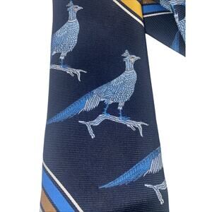 Jack Robbins Mens Necktie Pheasants Vintage 70s Blue & Gold Stripes 58” X 4.25”