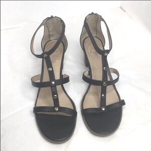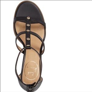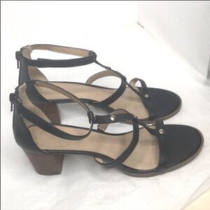 A studded T-strap balances the stacked block heel of a comfortably cushioned sandal with a flexible sole.