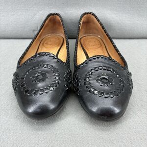 The Jack Rogers Waverly Black Shoes in women's size 6.5 are a stylish and comfortable slip-on flat. Crafted from leather, these shoes feature a sleek black color that is versatile and easy to pair with any outfit. With the Jack Rogers brand known for quality and attention to detail, these shoes are sure to be a chic addition to any woman's wardrobe.