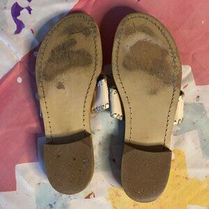 Timeless and effortlessly chic 🤍 These Jack Rogers 1960 Jacks sandals feature the brand’s signature whipstitch detailing and hand-crafted rondelle design in white and silver metallic leather. A true icon since 1960, the Jacks flat sandal pairs classic style with comfort, perfect for warm-weather getaways or coastal weekends. Size 6M (handwritten). Used, in good condition with normal wear.