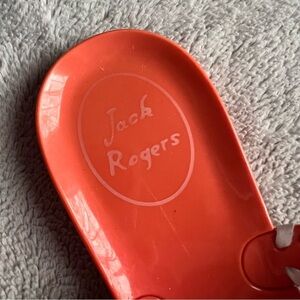 Good used condition. Alana Sandal by Jack Rogers in Coral, a pinky orange shade with white detailing. Preppy beach aesthetic, perfect for vacation or everyday wear this season. Slip-on flat resort flip flop sandal with logo-stamped tassel and leather whipstitch detailing, see video. Thong toe and open back. Jelly plastic construction. Note: light wear throughout with streetwear to bottom sole, fading to logo at insole and cracking at leather accents, see photos. Size 7, see photos for measurements.