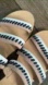 Tan, white, navy, peach/pink suede. Three strap flat sandals. Women’s size 8. Comfortable and easy to throw on.
