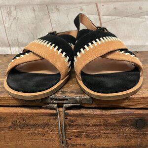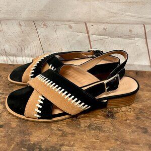 Jack Rogers Amelia City crisscross strapped open toe sandal with adjustable buckled sling back strap, color block straps, whipstitch detail