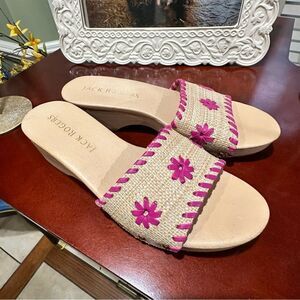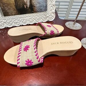 Exude a feminine vibe by completing your look, wearing the Jack Rogers Breakers Clog Sandals. Natural raffia and leather upper. Natural pig skin lining. Wood footbed. Slip-on style. Goldtone rondels and whipstitch detailing. Wood midsole. Open toes and block heels. Rubber outsole with added traction. Imported.