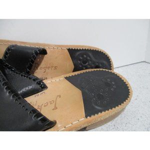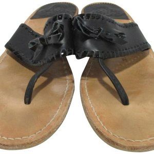 Jack Rogers Brown T- Strap Slip-on Thong Sandals. 7/8" block heels. Patent bow embellishment. Size stamp not visible. Approx. Size 10; measures 10-3/4" from heel to toe. Signature decorated insoles. All measurements are approximate. J0122A