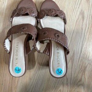 📄 ITEM DESCRIPTION: Elevate your sunny-day looks with these Jack Rogers Caroline wedge sandals in a neutral tan leather. With their signature whipstitch design and cushioned insole, these sandals offer both classic styling and comfortable wear — ideal for warm weather occasions or everyday chic. Approximately 2.75"H wedge. Material: Leather upper, rubber sole Closure: Slip-on Toe Style: Open toe Condition: Excellent pre-owned condition — very light wear on outsoles; uppers are clean 🎯 IDEAL FOR: • Everyday wear • Resort & vacation outfits • Casual weddings & events • Pairing with dresses, skirts, jeans, or shorts 📦 SHIPPING & RETURNS: Ships within 1 business day Carefully packed for safe delivery From a clean, smoke-free home
