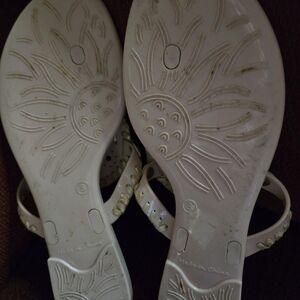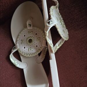 Jack Rogers Georgica Jelly Flip Flop Sandals. These are tan and gold and a size 8. The gold is flaking off of them a little.