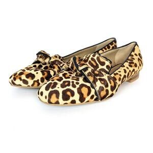 Jack Rogers Holly Leopard Print Haircalf Loafers. Designed with trimmed knot tops, the Holly Haircalf Loafers from Jack Rogers are sure to start a conversation. Neutral brown leopard print pattern. Slip on style. Almond toe. Medium width. Haircalf material. Excellent condition as shown in photos.