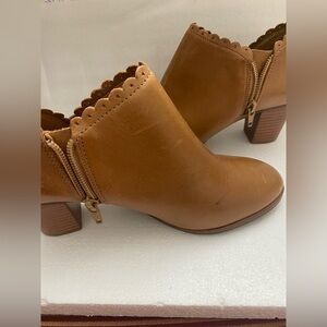 Jack Rogers ankle booties in tan leather feature a smooth finish and a stylish scalloped edge along the ankle.