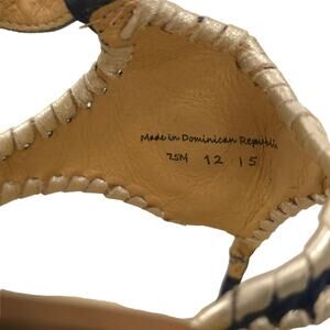 Triangular vamp w/ signature jack rogers gold whip stitching. Ankle strap with buckle and 5 hole adjustment option. Rubber signature “JR” logo embossed rubber soles.