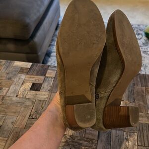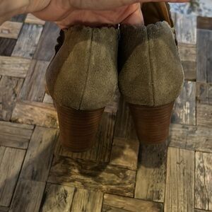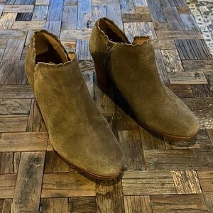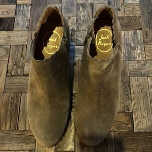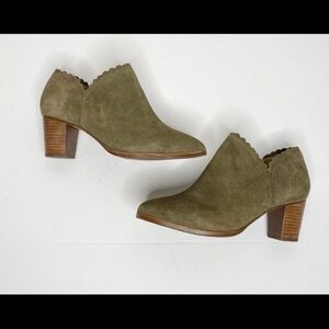 Jack Rogers Marianne Suede Booties. Zip closure. Taupe/olive green color. Stacked heel(2 1/2”). Scalloped edges. Size 8.5M