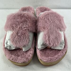 Cozy pink fuzzy slipper sandals. Slip-on style. Perfect for casual wear.