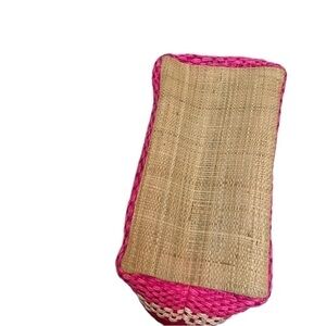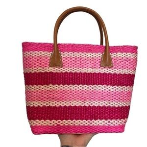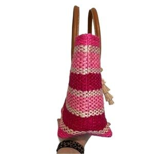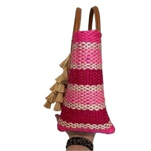 "Nothing says vacation better than the pink striped straw tote. This small leather handle tote with fun removable tassels is great for beach or street style.