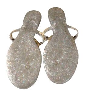 Stylish Jack Rogers sandals. Features silver base with rainbow glitter and tan leather detailing. Perfect for casual summer wear.