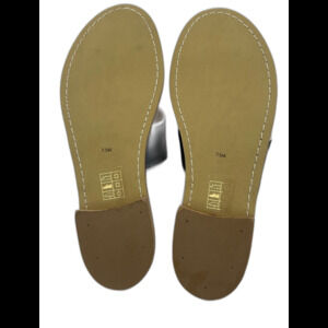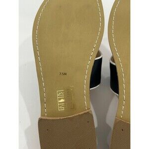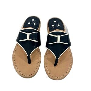 Jack Rogers Giselle Bow Thong Sandals. They are described as a thong-style sandal featuring a bow accent. The sandals are crafted from high-quality leather and colors navy with white details. They are a flat sandal style and a popular choice for both casual and dressier occasions. Please reference attached pictures for style, colors, condition and sizing. New without box