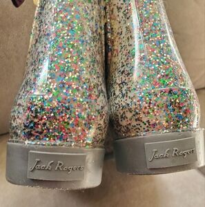 Jack Rogers Sallie Rain Boots are cast in a rainbow glitter upper and side gussets for a cute way to keep the rain away.