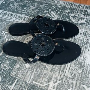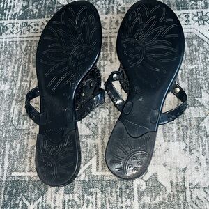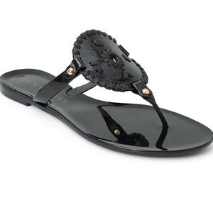 The Collins Jelly is an elevated take on classic jelly flip-flops. Simultaneously lightweight and luxurious, these Black jelly sandals feature a woven medallion detail and minimalist straps. From resort wear to patio days, the low profile of the Collins Jelly will have you basking in style.