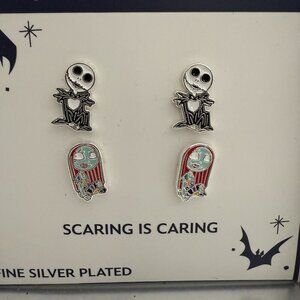 Here is a pair Jack Skeleton Sally Burton Nightmare Before Christmas Earrings Scaring is Caring fine silver plated Retail $50