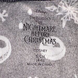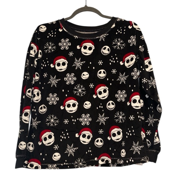 Cozy black fleece pajama top featuring Jack Skellington faces, snowflakes, and Santa hats — perfect for the holidays or Nightmare Before Christmas fans!