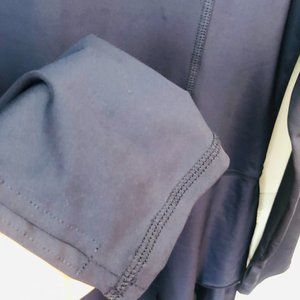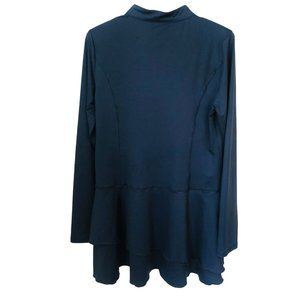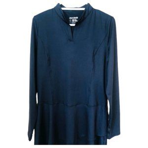 This navy blue tennis dress showcases a chic peplum design with a mock neck and long sleeves, perfect for time on the courts. The mandarin collar adds a refined touch, while the soft fabric offers a comfortable fit. No shorts.