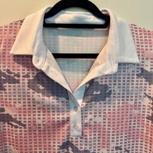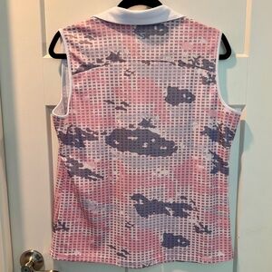 Jack Smith Sleeveless Golf Shirt, Size L, EUC. PInk/Gray print with white trim. 3/4" button up with collar. Straight hem, Lightweight. Measures: 21" arm pit to arm pit and and 24" length.
