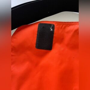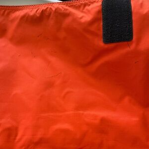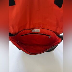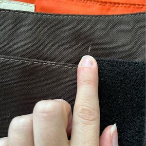 In good condition- light wear on bottom corners but no holes or rips. Inside top has some black pen marks and red marker mark- possibly could come out with soap but not 100% sure. Left velcro has some fabric stuck in it but still secures bag. Little white smudge inside flap can barely see. No rips or tears. Still has a lot of life