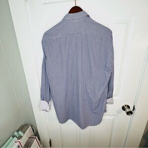 Jack Stone by Thomas Dean Gingham Plaid Casual Button Down Shirt Blue Maroon Purple Size Large. 100% Cotton. Long sleeves. Button up. Small check gingham plaid in blue and maroon. Contrasting purple diagonal plaid. Button cuffs. gently used Excellent Preowned Conditon.