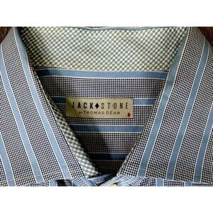 Introducing the Jack Stone dress shirt by Thomas Dean & Co. This classic fit shirt is made of 100% cotton twill and features a stylish striped pattern in shades of blue. The shirt has long sleeves with button cuffs, a collared neckline, and a spread collar style. It is perfect for various occasions, such as travel, weddings, parties, casual outings, and business meetings. This dress shirt is easy to care for, as it is machine washable and preshrunk and wrinkle-resistant. It is available in size XL and does not fit true to size. The shirt is not handmade and is made in China. It is a great addition to any man's wardrobe and is sure to make a statement.