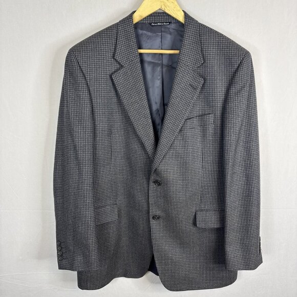 Jack Victor 100% wool houndstooth blazer. Made in Canada. Two-button front, notched lapels, fully lined interior, and four-button cuffs. Classic tailored fit in size 44R.