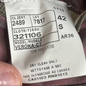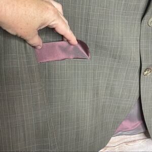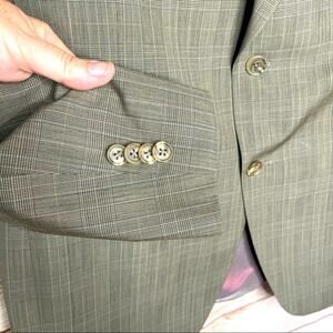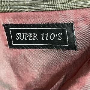 Item in Excellent Used Condition. Verona- CT model, 2 button closure, breast pocket functional lapel button hole, dual front flap pockets. Super 110's, 100% wool, 4 internal pockets, nylon iridecent lining, windowpane plaid, dual vented, four button sleeve. Measurements taken laying flat: