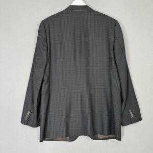 Details: Two button front, three exterior pockets (one chest, two flap), four-button cuffs, dual rear vents, notched lapels. Brown satin lining. High-end tailoring details.