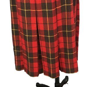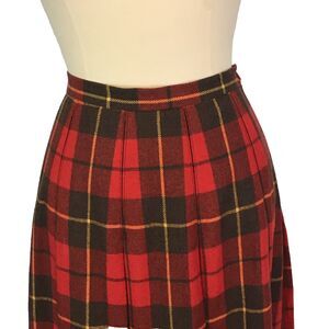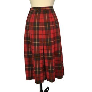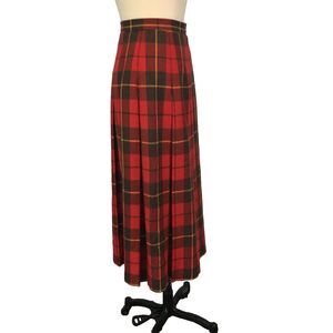 Vintage wool blend red plaid calf length skirt. Fitted waist, side zip with button, pleated. No pockets. Unlined.