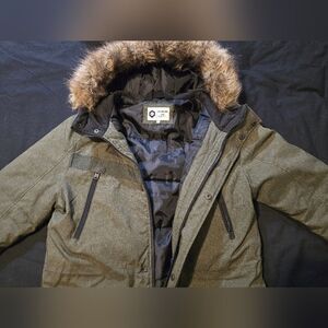 Stay warm and stylish with this olive green parka featuring a cozy faux fur hood. Perfect for chilly days. waterproof and durable perfect condition