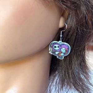 Heart shaped Jack and Sally dangle earrings from Tim Burton"s Nightmare Before Christmas. Made of sturdy acrylic plastic, lightweight and comfortable. Beautiful finish, bright colors. Great accessory to complete your Halloween costume, party outfit or daily wear.