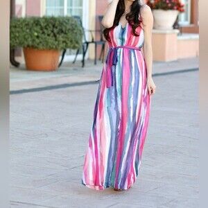The Jack by BB Dakota Joyner White Print Maxi Dress will bring a burst of color to any grey day! Gauzy woven poly is painted with vibrant fuchsia, blue, green, and peach watercolor print as it falls from adjustable straps into a triangle bodice, elasticized waist and a flowing maxi skirt.