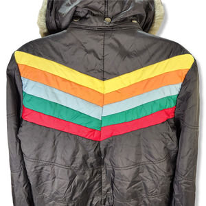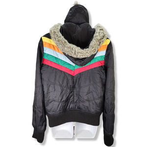 Stylish puffer jacket with multicolor chevron design. Features faux fur hood. Perfect for cold weather.