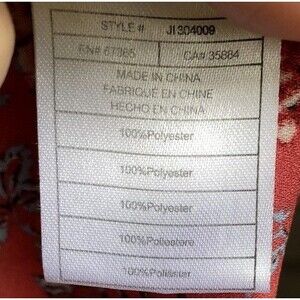 Material: 100% Polyester (Chiffon/Georgette) lightweight and flowy. Color: Raspberry red base with dainty floral print (burgundy, white, blue)