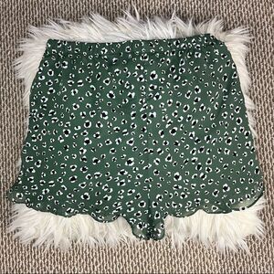 •2.25" Inseam •Tie waist 100% Polyester • Sage Green Animal Print • Elastic and Tie Waist • Ruffle Hem • Chiffon Shorts • Full Lined • Lightweight • Size Women’s Small