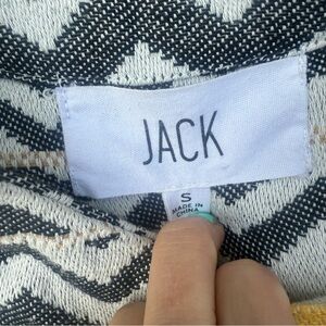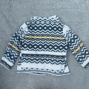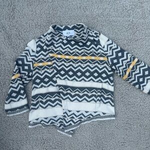 Description: Gray, ivory and mustard yellow southwestern pattern jacket, open front, fringe details on edges, 3/4 length sleeves ~ Condition: EUC , no holes, pills, stains, snags ~ Approximate flat measurements: Pit-to-pit 18, length 20 ~ Smoke free home