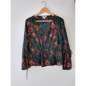 JACK by BB Dakota flowy, peasant style top with nice details. V-neck with button accents, collarless, empire waist with drawstring, peasant style sleeves with slits and accent ties. Dark floral aesthetic.