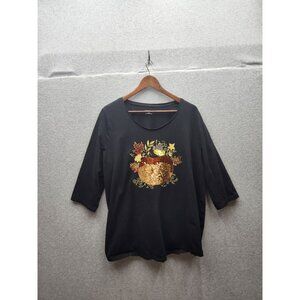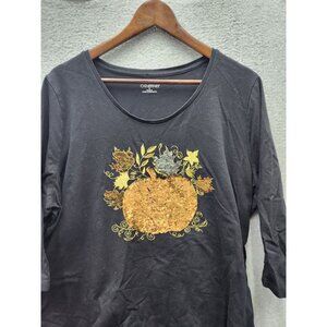 This Catherines top offers a stylish seasonal design with a sequin pumpkin graphic. The 3/4 sleeve length adds a touch of elegance, while the cotton-spandex blend promises comfort and flexibility. Ideal for enhancing your autumn wardrobe with a sophisticated touch, it’s crafted in Indonesia ensuring quality craftsmanship.