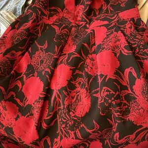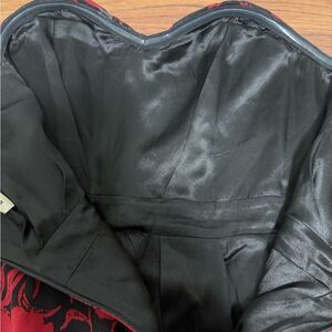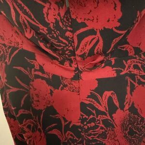 Jack Afalo strapless mini dress with sweetheart neckline, side pockets, back zipper with hook & eye closure , silk lined. Burgundy & black floral print.