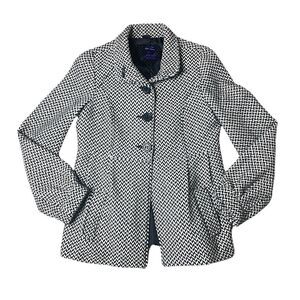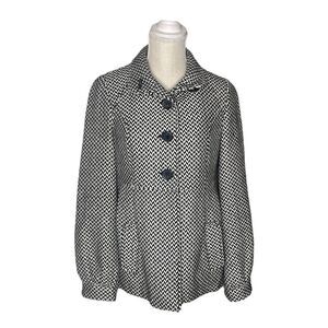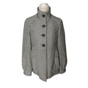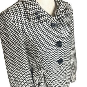 Jack BB Dakota Herringbone Jacket. Adorable Medium weight coat featuring a black and white knit herringbone. Has two side pockets, cuffed sleeves with buttons, 4 buttons. High collar that can be worn up or golden down. Empire waist with slight flare. Super low key feminine style. Very mod, retro.