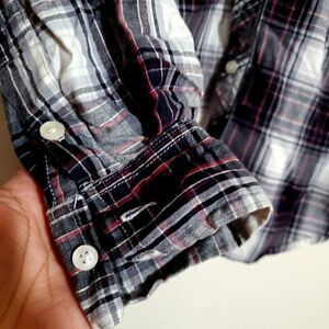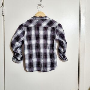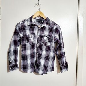 Black/White/Gray Button Down, long sleeve, plaid shirt. Pre-owned in good condition. Please refer to pictures for best description and condition verification. Size Medium- normally about a 7-8 Kids.