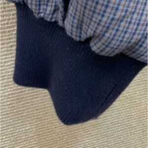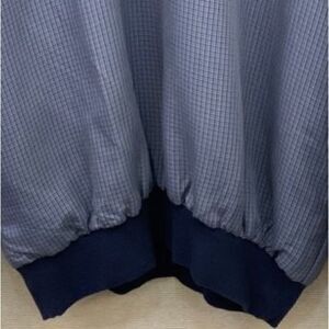 Jack Nicklaus golf windbreaker with V neck, 2 side pockets and full lining. Navy blue check with solid blue ribbed neck, cuffs and hem. Pullover style.