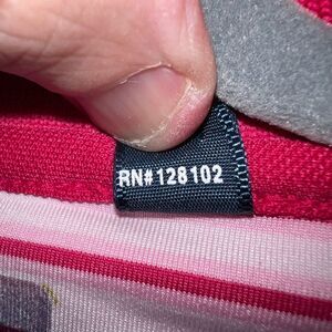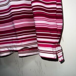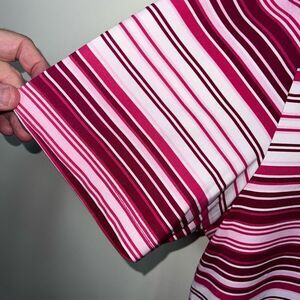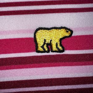Shades of red striping on white background. Light, smooth, and breathable polyester/spandex blend. The Golden Bear wouldn’t steer you wrong…